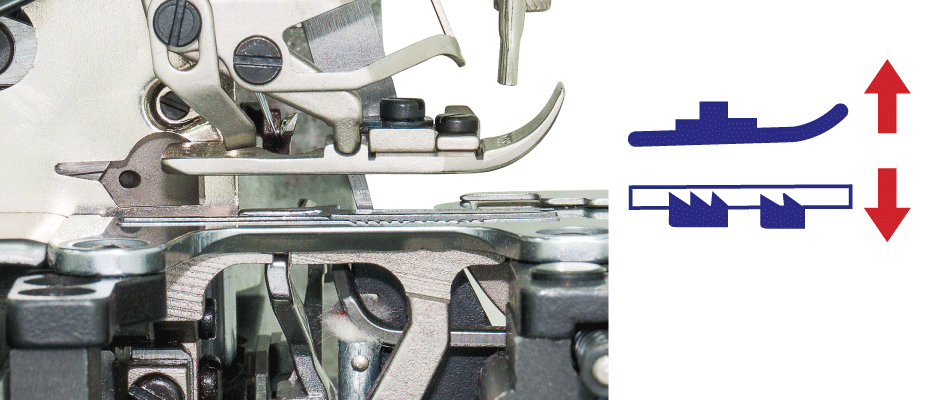 壓腳提昇時,送布齒即從針板上面落下,使得布料的設置作業更為便利。