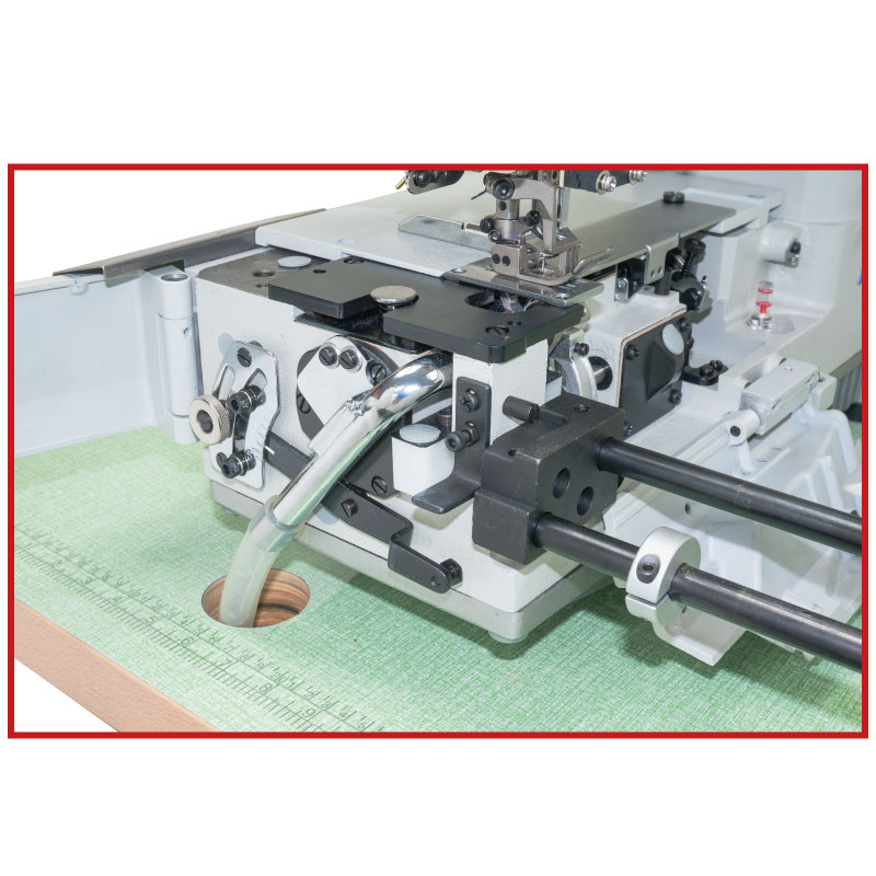 因為裝有差動上下送布縫紉機,上送布牙能更加牢固的輸送布料,防止了折邊縫工序中的布料扭曲。
