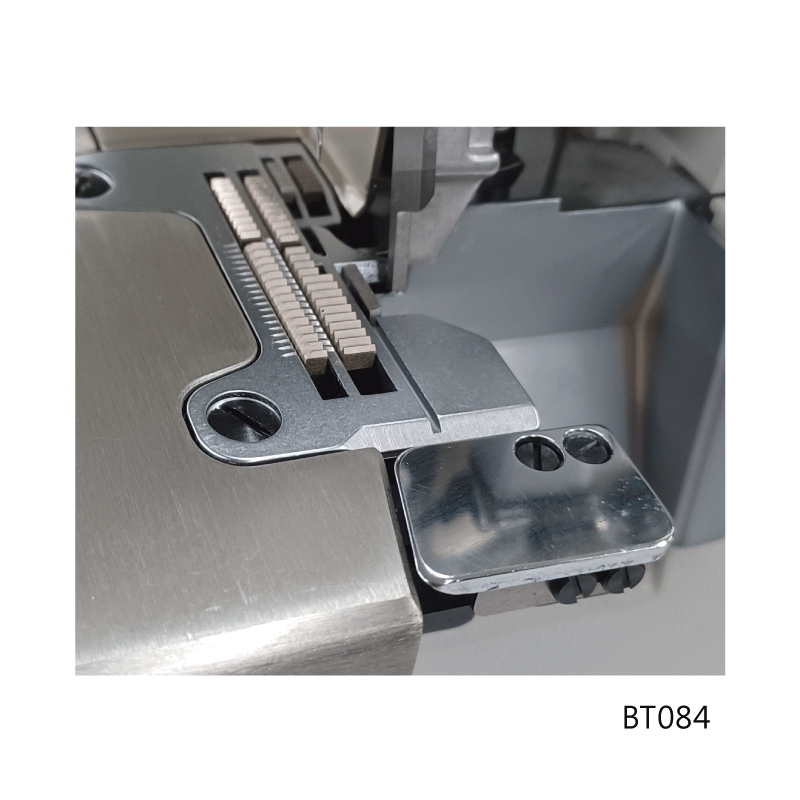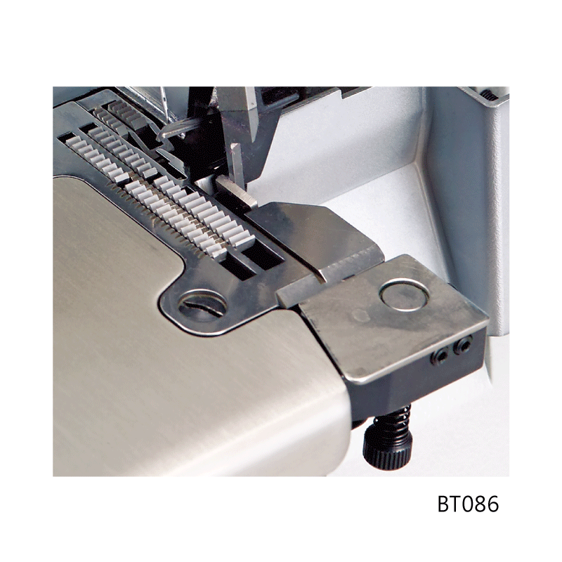 BT084, BT086 ・[圖] ・[說明]在每次車縫開始時,將預先夾住的線頭,包入一段於底線中,車縫後再將線拉回,在BT 裝置中剪斷並夾住。有BT084與BT086可供選擇,對應不同的車縫手勢。放鬆針線。 ・[零件冊]