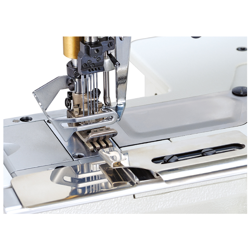 附有专用裁片接缝导模,可轻易将2片未经缝合之裁片并合再进行车缝 ,缝后裁片接缝处平顺,增加穿着时的舒适性。